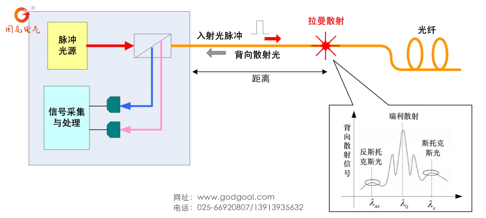 激光脈沖在光纖內(nèi)部的傳輸過(guò)程中有背向散射光出現(xiàn),散射光 Stokes 和Anti-stokes 受到溫度變化影響,其中 Anti-stokes 受溫度影響較大,其它波長(zhǎng)則不受溫度變化影響。當(dāng)光纖沿線某處溫度發(fā)生變化時(shí),它的強(qiáng)度會(huì)發(fā)生變化。通過(guò)精確地測(cè)量散射光的信號(hào)強(qiáng)度差,可以準(zhǔn)確地測(cè)量溫度。測(cè)量返回光脈沖的到達(dá)時(shí)間,可以確定溫度讀數(shù)的位置,這與顯示汽車或飛機(jī)距離的雷達(dá)回聲類似。