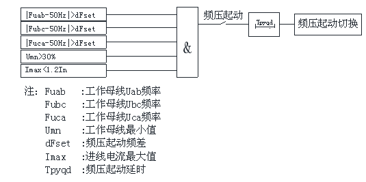 >頻壓起動(dòng)。頻壓起動(dòng)主要用于進(jìn)線(xiàn)電流很小,進(jìn)線(xiàn)電源因各種原因消失后,工作負(fù)荷孤網(wǎng)運(yùn)行,母線(xiàn)的頻率會(huì)偏離工頻,此時(shí)無(wú)流起動(dòng)和逆功率起動(dòng)不適合,其邏輯圖如下。