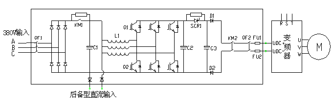 三相交流電能經(jīng)斷路器QF1進(jìn)入三相整流回路,脈動(dòng)直流經(jīng)限流電阻對(duì)C1預(yù)充電,預(yù)充結(jié)束后通過(guò)直流接觸器KM1旁路限流電阻對(duì)電容C1滿(mǎn)荷充電。電感L1與Q1和Q2構(gòu)成BOOST 型式的升壓電路,將C1上的直流電荷泵到更高電壓對(duì)C2進(jìn)行充電,并經(jīng)預(yù)充限流電阻對(duì)電容C3充電,經(jīng)晶閘管及二極管防逆流回路到直流接觸器后經(jīng)斷路器和熔斷器,送入變頻器的直流母線(xiàn)。