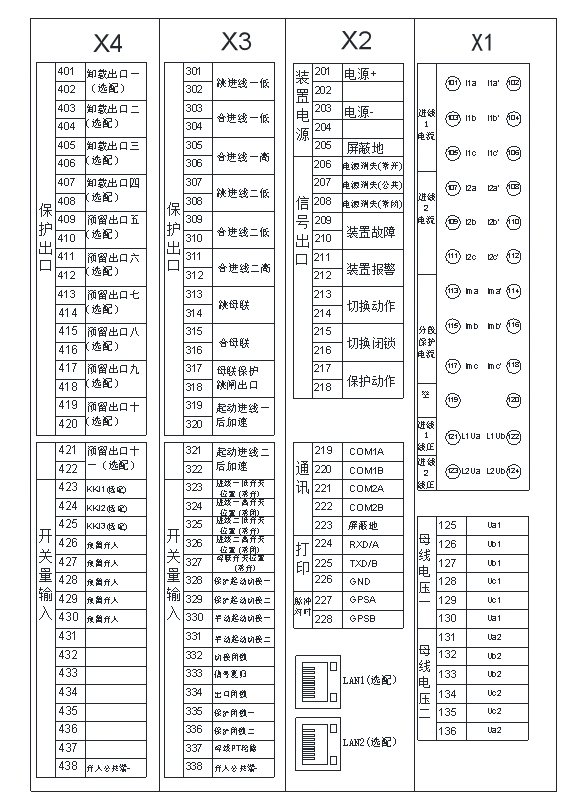 首先看一下背板接口分布,一共有四個(gè)區(qū)域,分別是X1,X2,X3和X4,X1是模擬量采樣板,負(fù)責(zé)采集進(jìn)線(xiàn)和母線(xiàn)的電流、電壓信號(hào)。X2板包括裝置電源接口、信號(hào)輸出口、485通訊口、遠(yuǎn)程打印接口和GPS時(shí)鐘。X3是遙信/出口板,包括開(kāi)入量和開(kāi)出量,X4是一塊擴(kuò)展板,根據(jù)現(xiàn)場(chǎng)具體需求,可擴(kuò)展多個(gè)開(kāi)入量和開(kāi)出量。