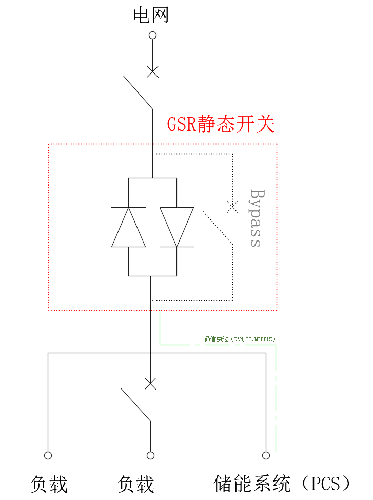 靜態(tài)開關(guān)是一個連接電網(wǎng)和關(guān)鍵負載的高速開關(guān),正常工作時接通,PCS充電、并網(wǎng)模式由EMS系統(tǒng)正常管理,關(guān)鍵負載和PCS均通過GSR接入電網(wǎng)。當電網(wǎng)故障或擾動時,GSR高速識別電網(wǎng)異常后,主動脫離電網(wǎng)并通知PCS系統(tǒng)(也可以由PCS系統(tǒng)指令完成離網(wǎng)),將負載快速隔離電網(wǎng),以便PCS離網(wǎng)模式起動。