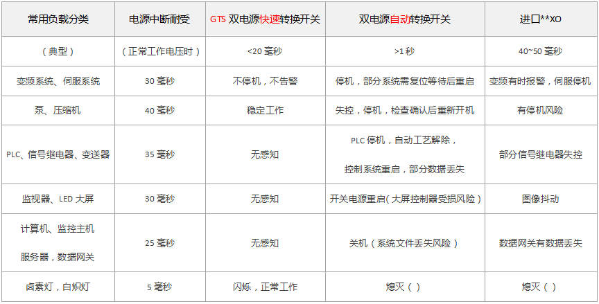 GTS雙電源快速轉換開關不同于普通ATS雙電源自動轉換開關應用在當常用電源發(fā)生晃電故障時通過備用電源快速安全切換,來確保負載連續(xù)供電。常規(guī)ATS(雙電源自動轉換開關)因采集、控制、滅弧工藝等限制,備用電源安全投入需等待數秒甚至數十秒時間,大多數負載尤其是工業(yè)連續(xù)負載如:電機、變頻、PLC控制及各類自動化控制系統(tǒng),全部停機,嚴重影響安全生產、經濟效益甚至引發(fā)生產事故。